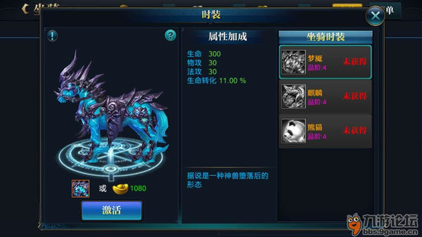 梦魇时装,属性加成,生命+300.物攻+30.法攻+30,生命转化11%.同样梦魇时装看着好像幽冥骑士的马有木有,梦幻神驹,青马王子的选择。价格1080金子。