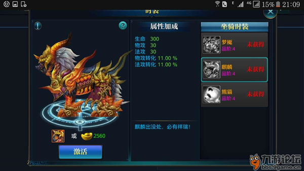 麒麟时装,属性加成,生命+300.物攻+30.法攻+30.物攻转化11%.法攻转化11%,麒麟时装威武霸气,胯下麒麟,千离厮杀,一站即达,价格2560金子。