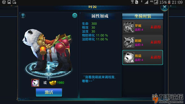 熊猫时装,属性加成,生命+300.物攻+30.法攻+30.物防转化11%.法防转化11%,非常可爱的一款,相信很多萌妹子都喜欢,可爱熊猫,阿竹同款,适合同样可爱的你,价格1980金子。