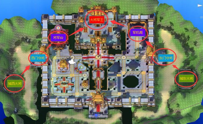 国战的战斗流程为:剑门关大将—城西、城东大将—西门、东门守将—将军台、军机阁—大将军王。值得一提的使想要对守城方的大将军王进行伤害攻城方的玩家们必须要先击败西门守将或东门守将。守城方则应当想尽一切方法阻止攻城方对大将军王造成伤害,因为对于攻城方的玩家们来说对大将军王所造成的伤害直接决定了国战所获得的战果。