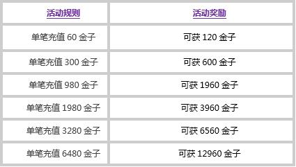 活动内容:玩家在游戏充值越多金子、即可获得额外奖励~只需充值超值金额,即可获得双倍金子返还。
