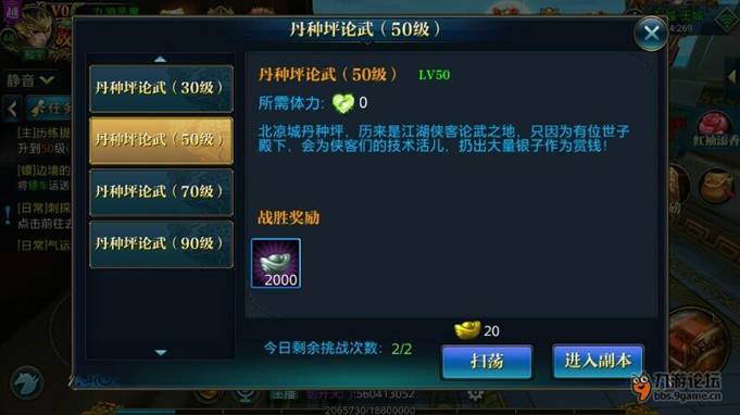 每天可以挑战两次,30级的丹种坪伦武通过就可以获取1200银币了,懒得去打还可以使用20金子扫荡,这个比摇钱树值多了。随着等级50级,70级,90级,还会开启更高奖励的关卡。所以努力提升等级吧!