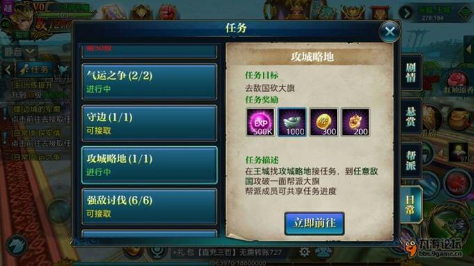需要40级且加入帮派才可以做,每天只能做一次,到王城接取任务,到任意敌国砍倒一面大旗就可以完成了,帮派成员可以共享进度。完成后就可以获取银币奖励了,