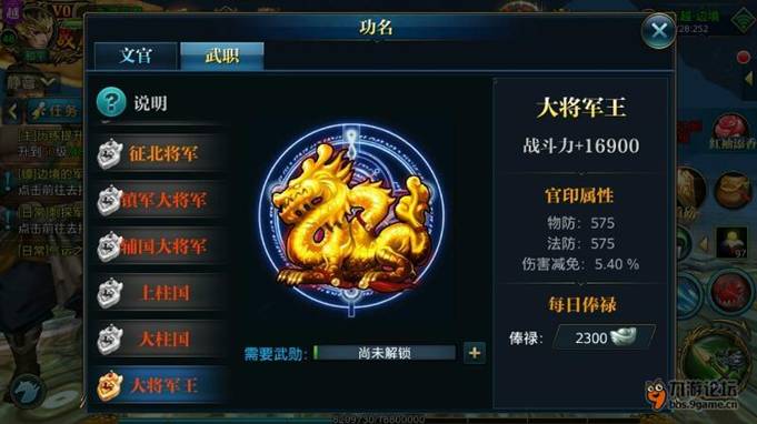 在功名里面的武职哪里,会根据你的官位可以领取不一样的奖励,官位越高,奖励越多,提升武职需要功勋,功勋可以通过擂台争霸,国战,击败敌国玩家获取。