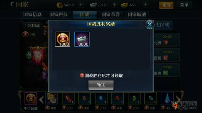 差不多每天晚上都有国战打,参加国战就可以在界面重磅里面领取参加奖励,根据参加的次数,奖励也越来越多,而国战胜利了,还可以领取8000银币,失败了貌似只有2000银币。所以一个国家的强弱很重要,而且需要大家一起参加国战,尽一分力才能取胜。